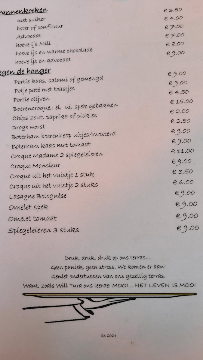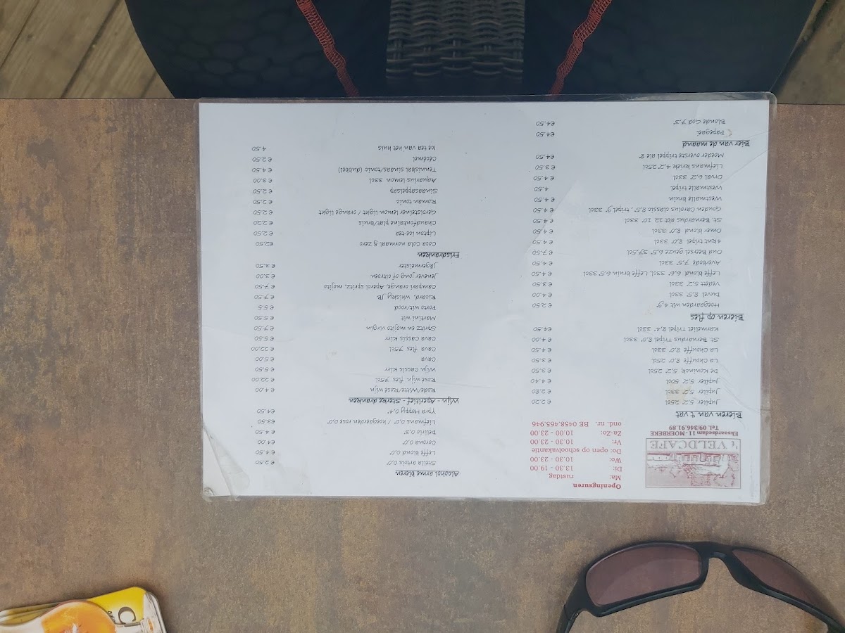 The menu at Het Veldcafe offers a simple and inviting selection that suits its relaxed and friendly atmosphere. You’ll find casual bites and comforting drinks designed to accompany moments of rest, whether you’re stopping by for a quick snack after a bike ride or settling in for a leisurely afternoon on the terrace.